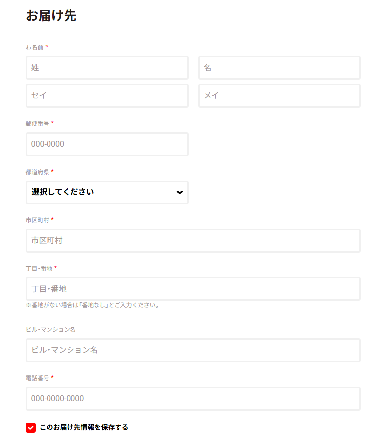 - 住所:数字は全角でも半角でもどちらでも大丈夫です(国外に発送はできません)。