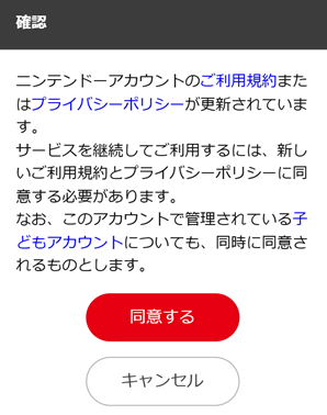 2025/05/07付けで、ニンテンドーアカウントの利用規約及びプライバシーポリシーが更新されました。それに伴い、Switch本体やスマートフォンアプリ、任天堂HP上で利用規約の同意が求められています。