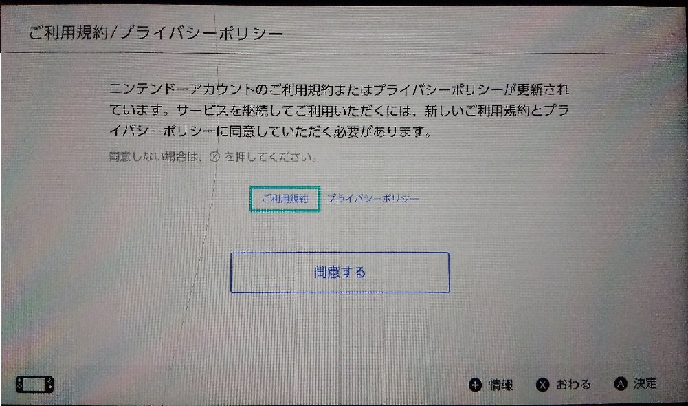 オンラインプレイやニンテンドーeショップなどのニンテンドーアカウントに関連するサービスを利用しようとすると、利用規約/プライバシーポリシーへの同意を求める画面が表示されます。
