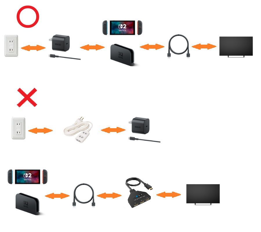 Switch用や、ワット数の低い他社製ACアダプターだと供給電力不足のためTVモードになりません。