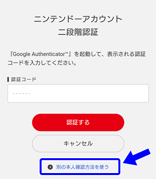 - 「認証コード」の入力画面下にある「別の本人確認方法を使う」を選択